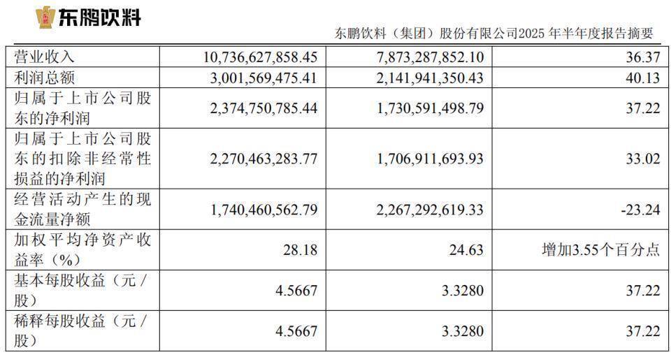 日前,东鹏饮料披露了2025年上半年财报,据财报数据显示,公司上半年实现营收107.37亿元,同比大涨36.37%,实现归母净利润23.75亿元,同比大涨37.22%,这是东鹏史上首次半年营收突破100亿大关!
